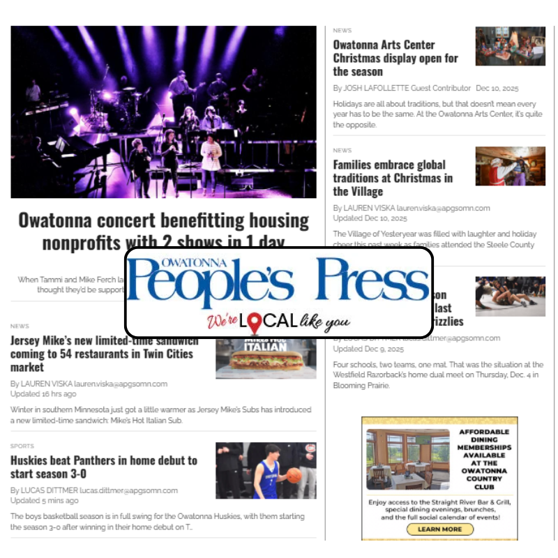 < Back Save Owatonna People's Press135 Pearl Street West Owatonna, Minnesota 55060 United StatesDetailsOpen in Google Maps Map Owatonna People's Press Visit Website Email 135 Pearl Street West Owatonna, MN 55060 (507) 444-2378 Overview Map Newspapers & free publications. Websites and Magazines
