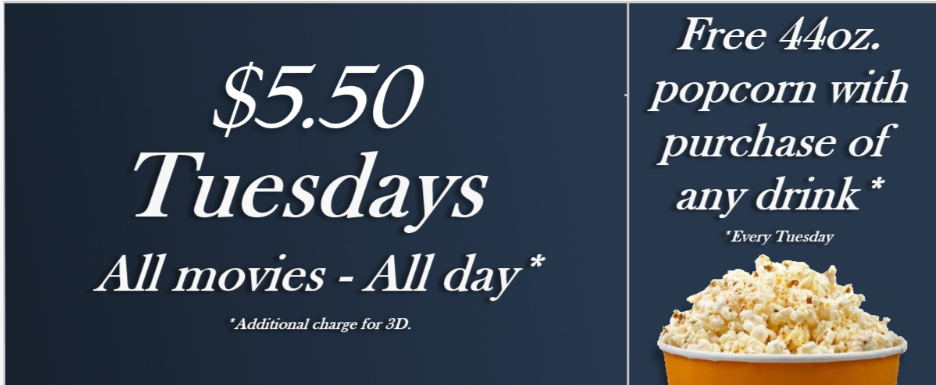 $5.50 -All Movies every Tuesday, all day (3D movies additional charge)
