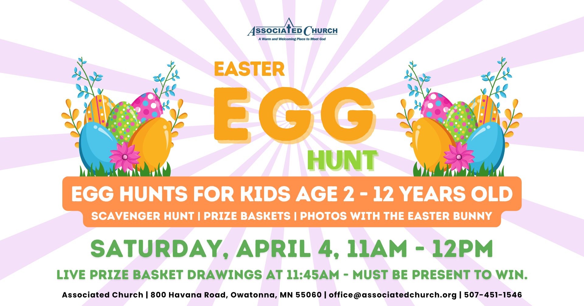Kids and families are invited to join us for a free community Easter Egg Hunt on Saturday, April 4, 2026. There will be Egg Hunts for kids from 2 - 12 years old in sections roped off by age. Kids will get to collect eggs containing candy and toys. While you wait, or after you collect your eggs, kids can use the playground, enjoy some carnival style games, and take photos with the Easter Bunny and participate in an Easter themed scavenger hunt for guaranteed prizes, as well as to get a ticket for entry into drawings for one of various prize baskets. A live prize drawing will be held at 11:45am; you must be present with a matching ticket stub to win