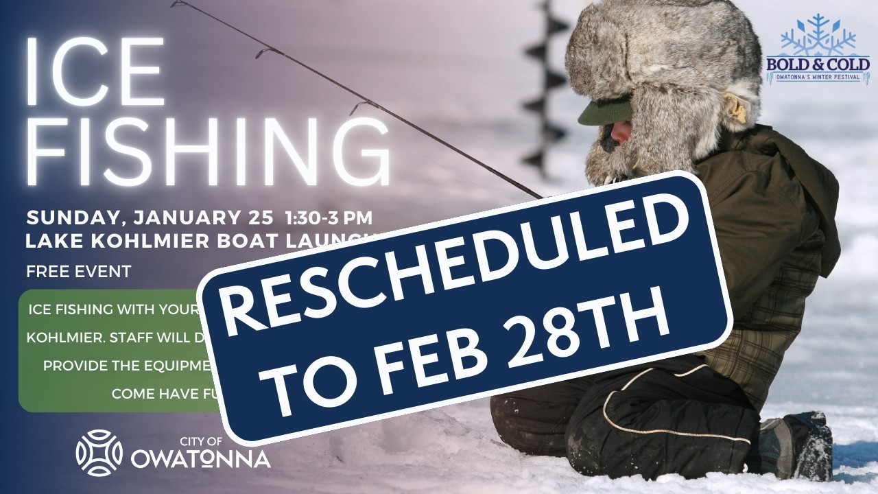 < Back Save Bold & Cold Ice Fishing1205 18th St SW Owatonna, Minnesota 55060 United StatesDetailsOpen in Google Maps Map February 28, 2026 1:30 PM – 3:30 PM Bold & Cold Ice Fishing Visit Website Lake Kohlmier Boat Launch 1205 18th St SW Owatonna, MN 55060 Overview Map Ready to take the bait? We’ll supply all the gear — no fishing license needed! Perfect for all ages to reel in some fun at Lake Kohlmier. Cost: Free (No registration required)