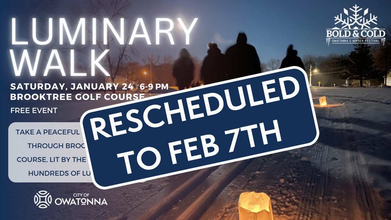 < Back Save Bold & Cold Luminary Hike1369 Cherry St Owatonna, Minnesota 55060 United StatesDetailsOpen in Google Maps Map February 7, 2026 6:00 PM – 9:00 PM Bold & Cold Luminary Hike Visit Website Brooktree Golf Course 1369 Cherry St Owatonna, MN 55060 Overview Map Take a peaceful nighttime walk through Brooktree Golf Course, lit by hundreds of glowing luminaries beneath a blanket of stars.