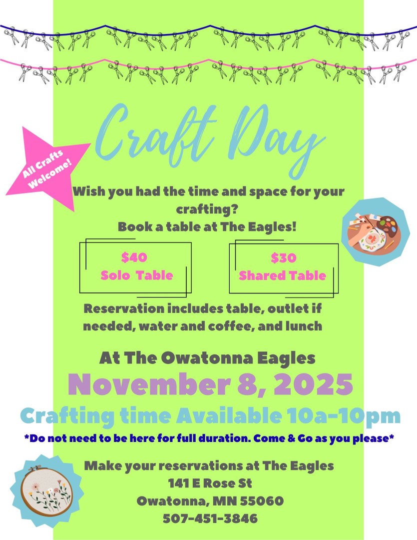 Mark your calendars for Saturday, November 8 from 10 AM – 10 PM for a full day of creativity, crafting, and community at the Owatonna Eagles!