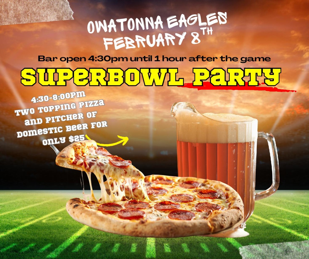 #OwatonnaEagles #SuperBowl2026 #GameDaySpecials #OwatonnaMN #SuperBowlParty #Eagles1791 #PizzaAndBeer #SupportLocal