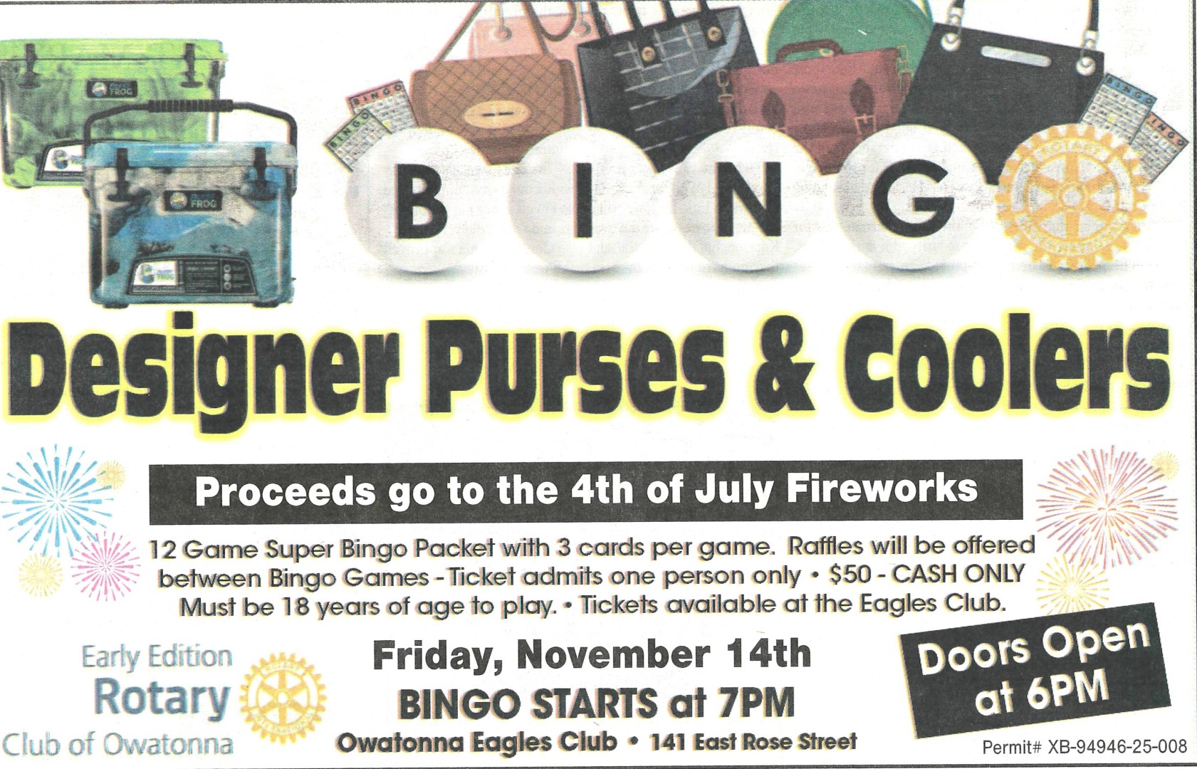 < Back Save Early Edition Rotary BINGO Designer Purses & Coolers141 East Rose Street Owatonna, Minnesota 55060 United StatesDetailsOpen in Google Maps Map November 14, 2025 6:00 PM – 10:00 PM Early Edition Rotary BINGO Designer Purses & Coolers Owatonna Eagles Club 141 East Rose Street Owatonna, MN 55060 Overview Map Proceeds go to the 4th of July Fireworks.12 Game Super Bingo Packet with 3 cards per game. raffles will be offered between BINGO Games-Ticket admits one person only-$500 CASH ONLY.Must be 18 years of age to play-tickets available at the Eagles Club.Doors open at 6PM