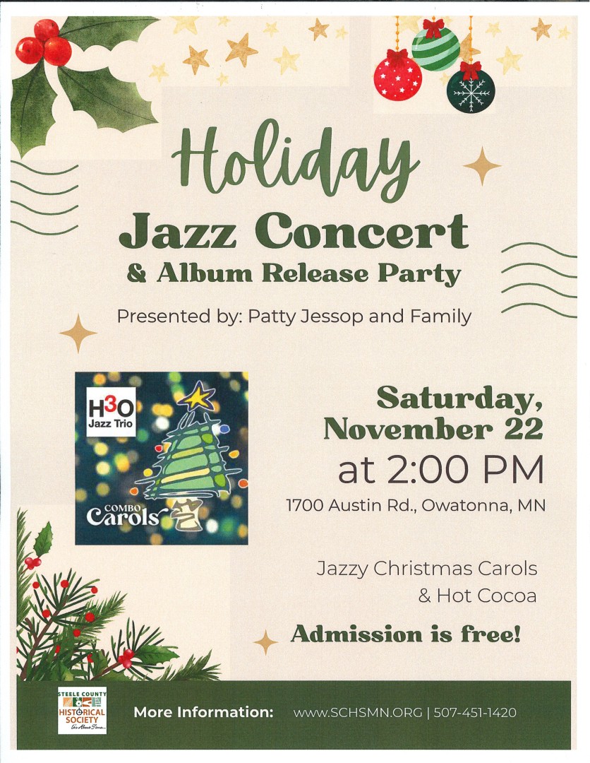 What happens when your favorite holiday tunes cozy up with jazz standards? Combo Carols, H3O Jazz Trio’s new holiday album, features 13 original mashups with the group joined by family and friends. Come and celebrate the album release on Saturday, November 22 from 2:00 – 3:30 pm at the Steele County Historical Society (1700 Austin Road, Owatonna). Joining H3O will be John Sievers on trombone, Randy Nelson on drums, and H3O’s “mom” Janet Heukeshoven on flute. Selections from the new album will be performed throughout the afternoon as well as a few bonus tracks. The event is free and open to all. Copies of the new CD and the trio’s first album, TafelJazz, will be available for purchase.