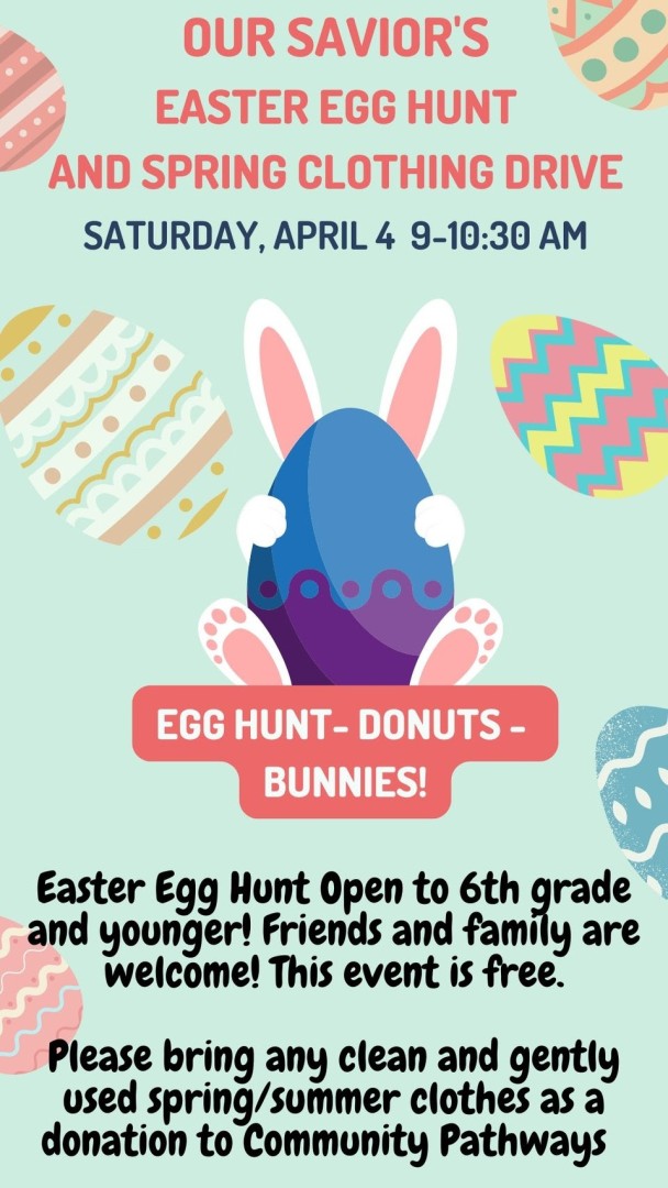 < Back Save Our Saviors Easter Egg Hunt & Spring Drive Clothing1909 St Paul Road Owatonna, Minnesota 55060 United StatesDetailsOpen in Google Maps Map April 4, 2026 9:00 AM – 10:30 AM Our Saviors Easter Egg Hunt & Spring Drive Clothing Visit Website Our Saviors Lutheran Church 1909 St Paul Road Owatonna, MN 55060 Overview Map Easter Egg Hunt Open to 6th grade and younger! Friends and family are welcome. This event is free.Please bring any clean and gently used spring/summer clothes as a donation to Community Pathways.