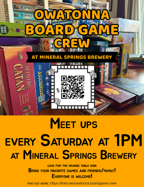 Saturday afternoons we’re hosting the Owatonna Board Games Crew for a few hours, welcome to all gamers! Check out the Facebook event page, linked below, to learn more about the specifics of the week!