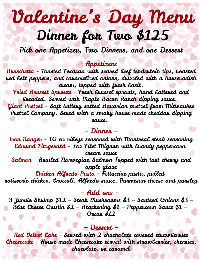 Home Save Valentine's Menu for Two at Timberlodge Steakhouse4455 Frontage Road W Owatonna, Minnesota 55060 United StatesDetailsOpen in Google Maps Map February 14, 2026 11:00 AM – 9:00 PM Valentine's Menu for Two at Timberlodge Steakhouse Timberlodge Steakhouse 4455 Frontage Road W Owatonna, MN 55060 Map
